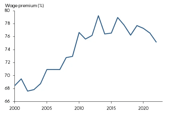While bachelor's degrees may still confer an "earnings premium," this advantage has diminished in recent years, further intensifying debt burdens. Economists refer to the premium as graduates with four-year degrees earning substantially higher lifetime pay compared to those with only high school diplomas. Federal Reserve data quantifies this premium—it peaked around a 79% pay advantage in the mid-2010s for degree holders, after gaining roughly 10 percentage points the preceding decade. More recently though, as college costs and debt loads climbed, the premium edge has fallen to 75% (FRBSF).